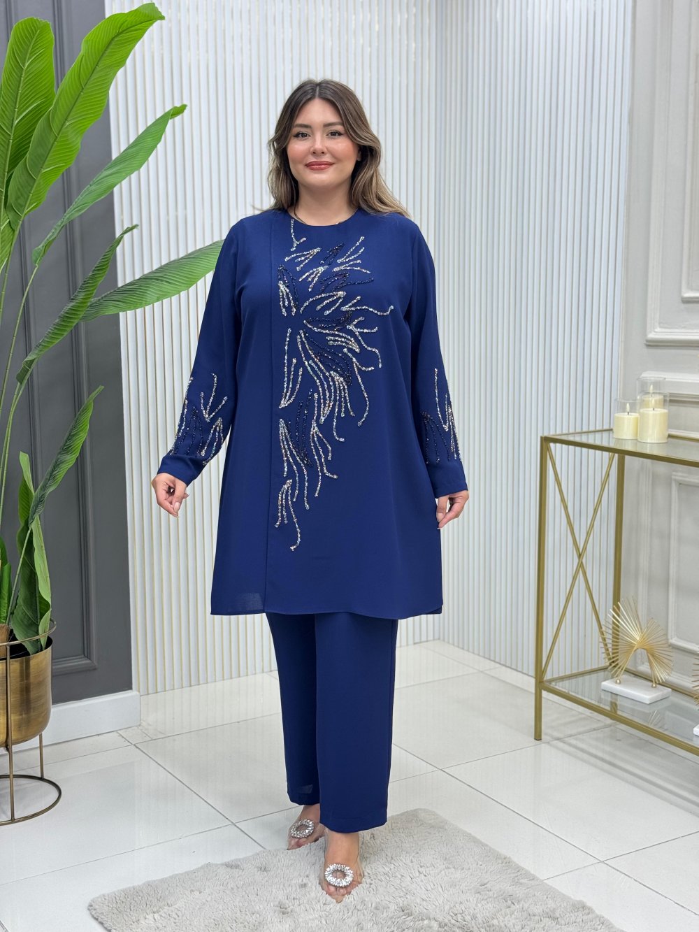 Tunik omuz kısmında pres taşlıdır.