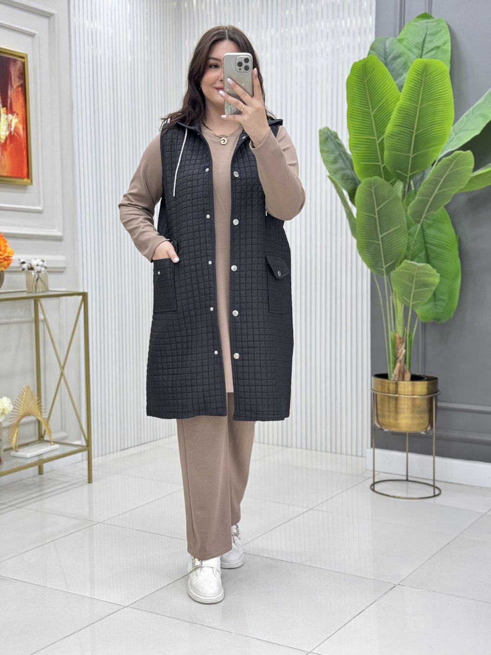 Kapitone kumaş, kapüşonlu.