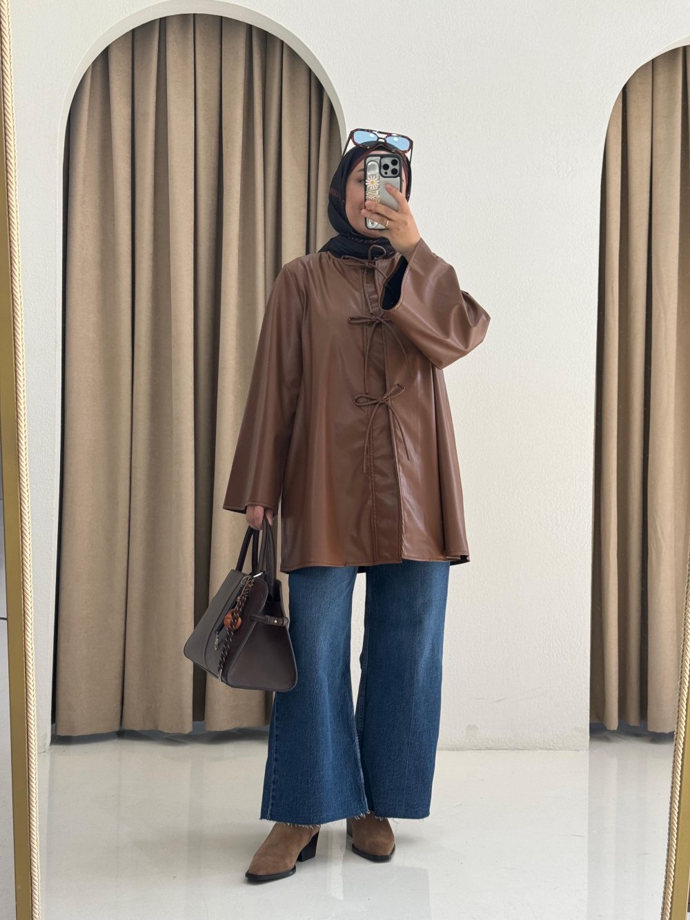 Bağlama Detaylı Uzun Deri Ceket Kahverengi