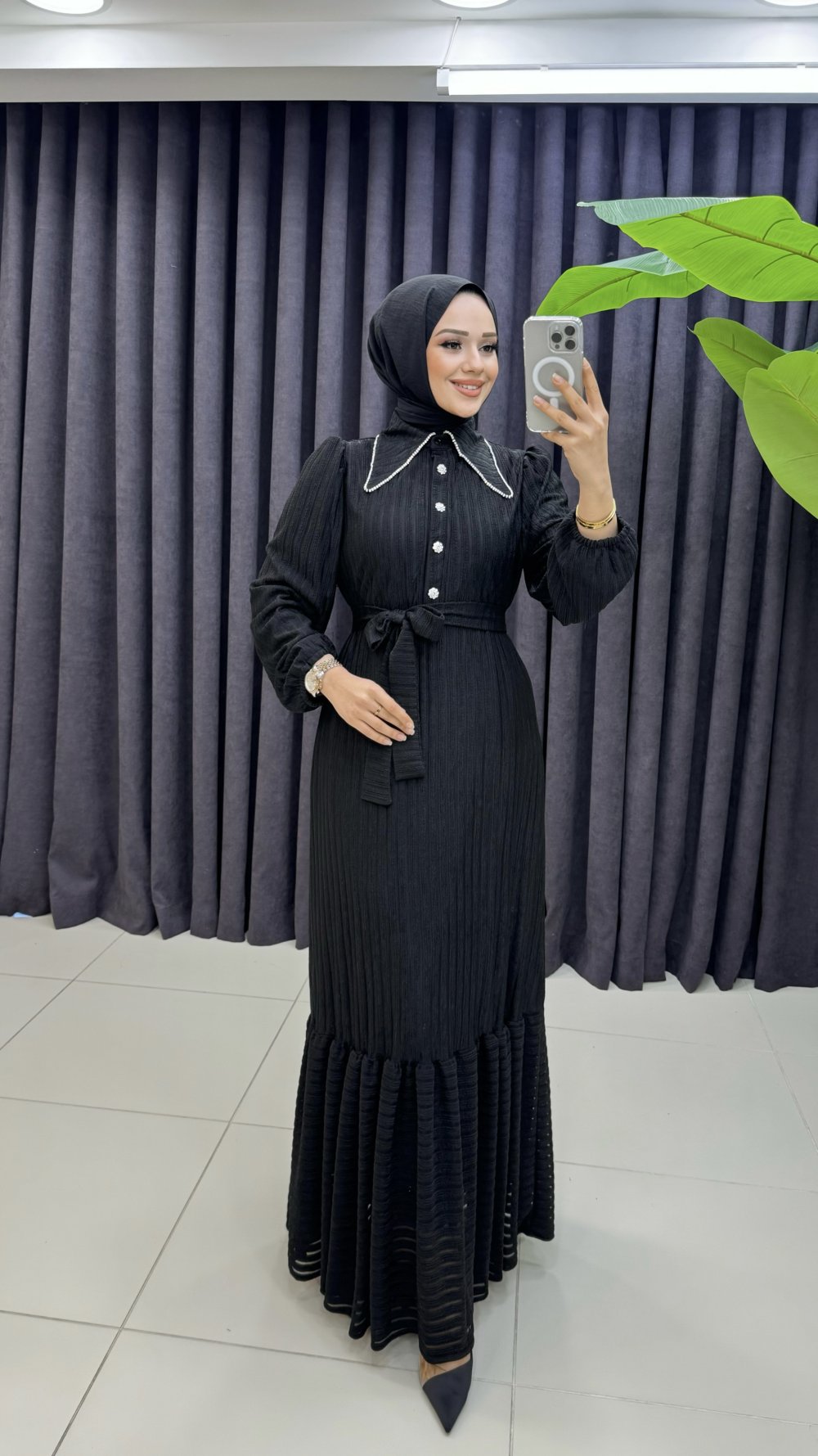 ELBİSE YAKA TAŞ DETAYLIDIR.