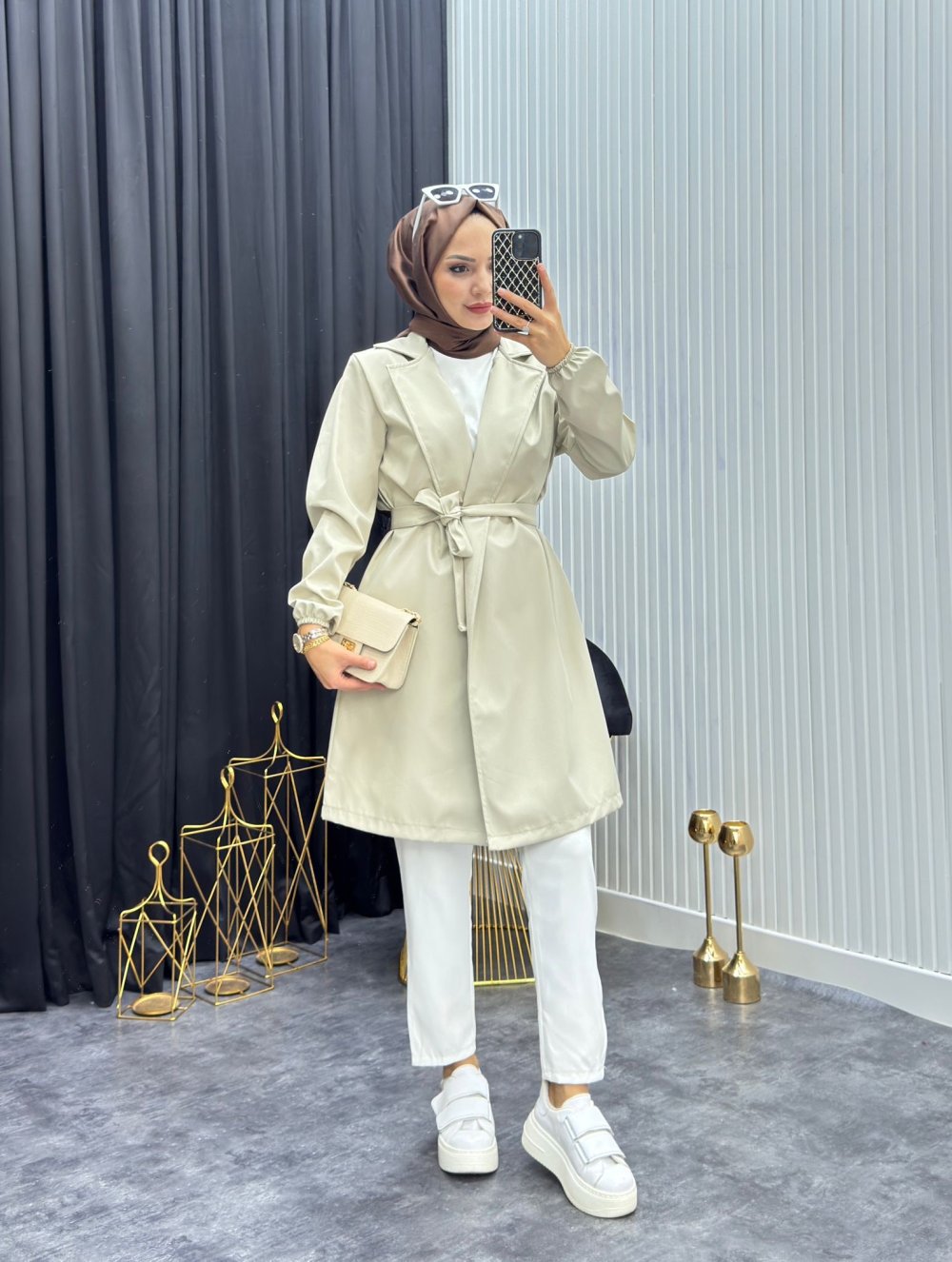Kruvaze yaka belden seyyar kuşaklı kol manşetleri lastikli yandan çift cepli trençkot.