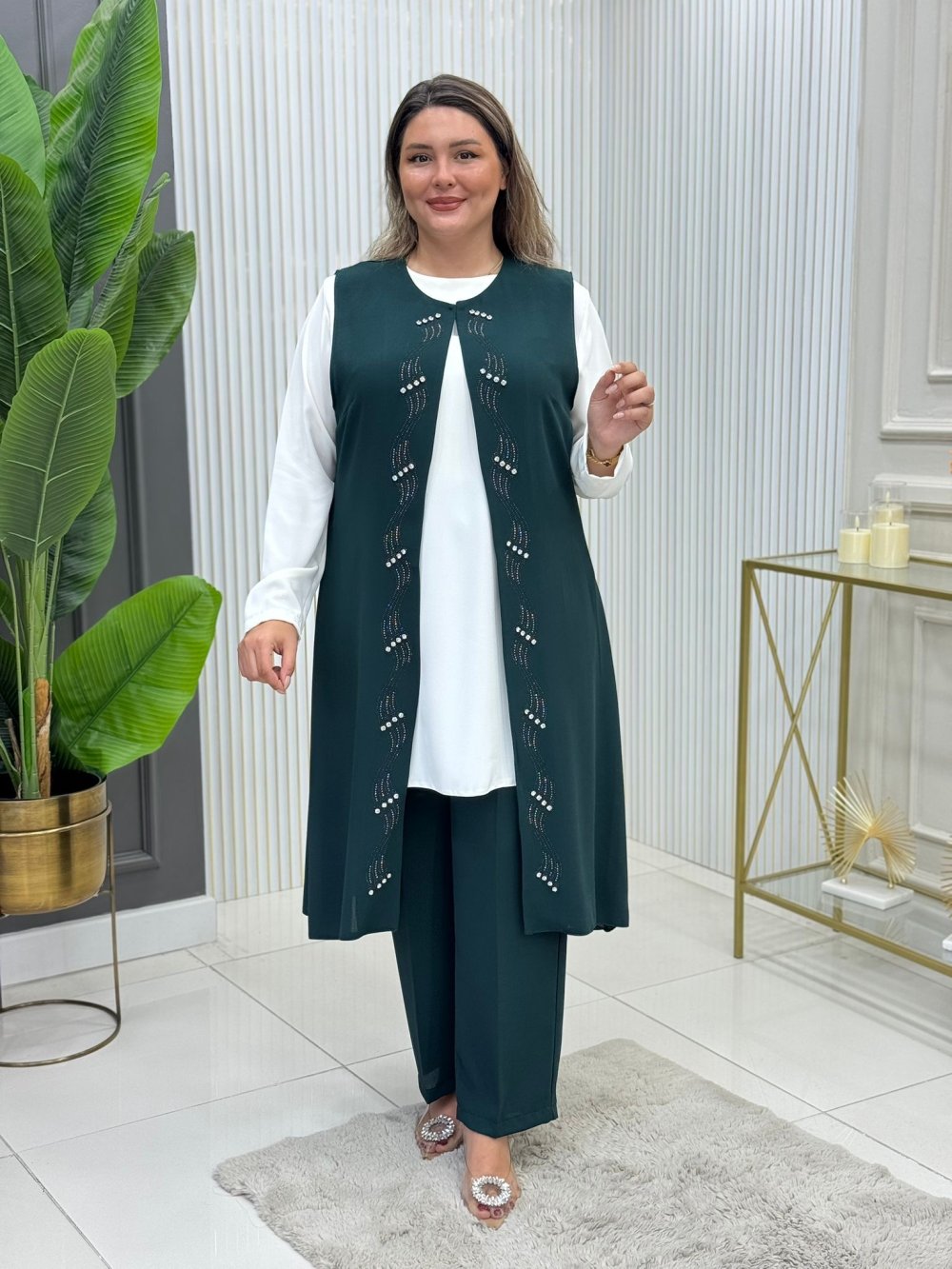 İçlik uzun kolludur, yelek yakadan kancalıdır.