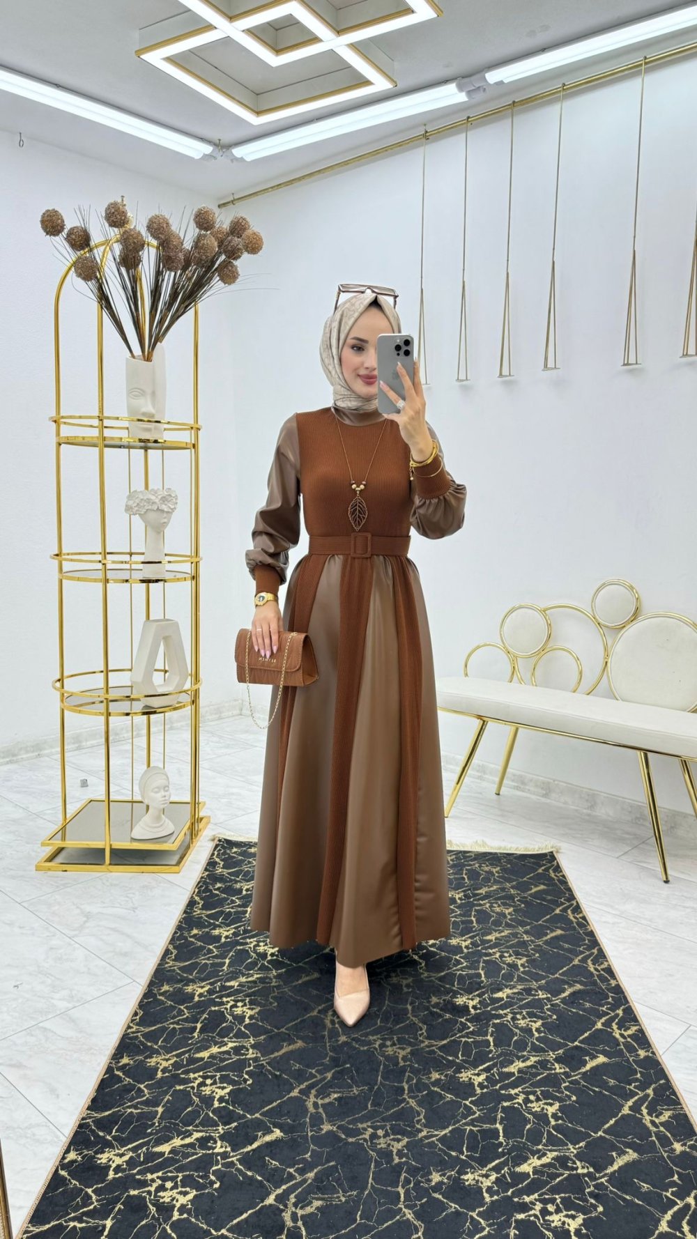 Kahve Prenses Deri Elbise Tesettür Giyim