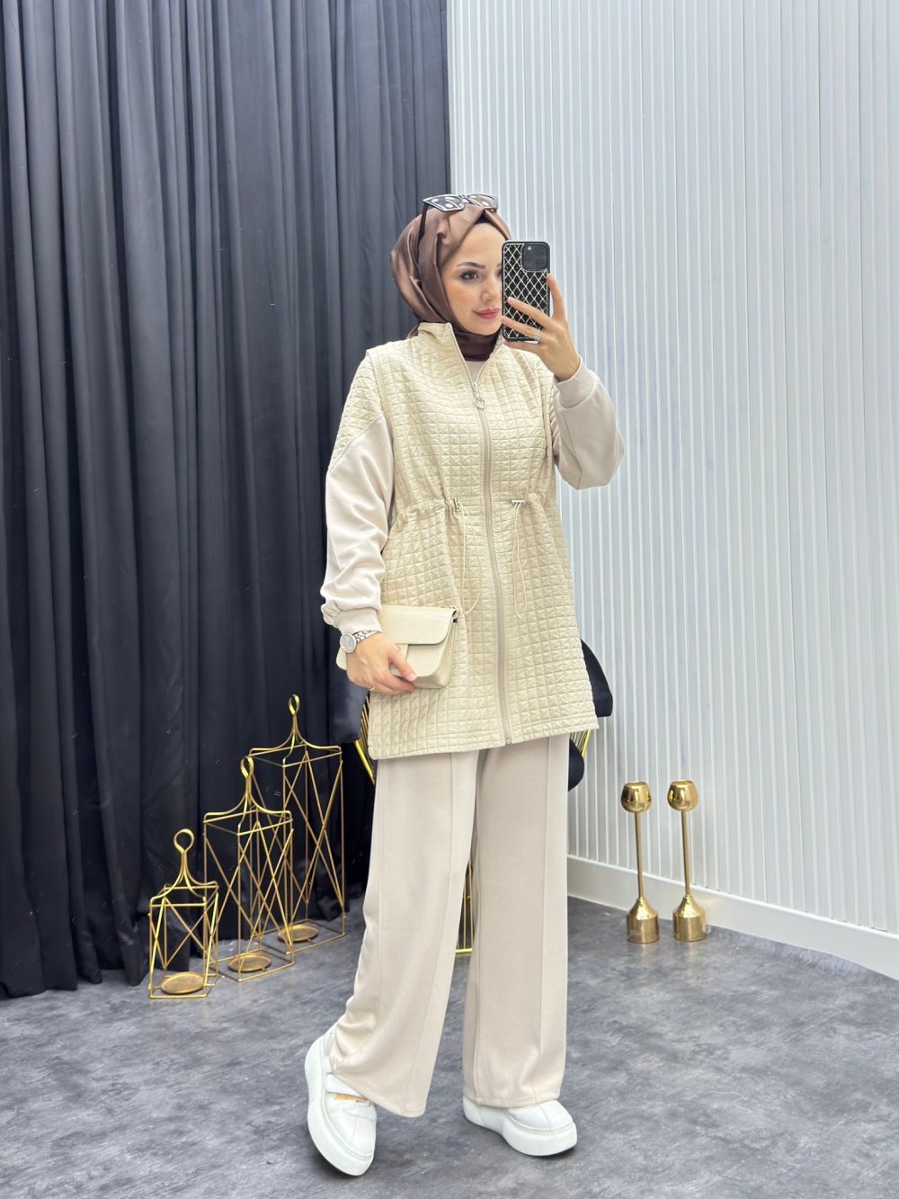 takım 3 parçadan oluşmaktadır yelek boydan fermuarlı belden ayarlamalıdır pantolon beli lastiklidir