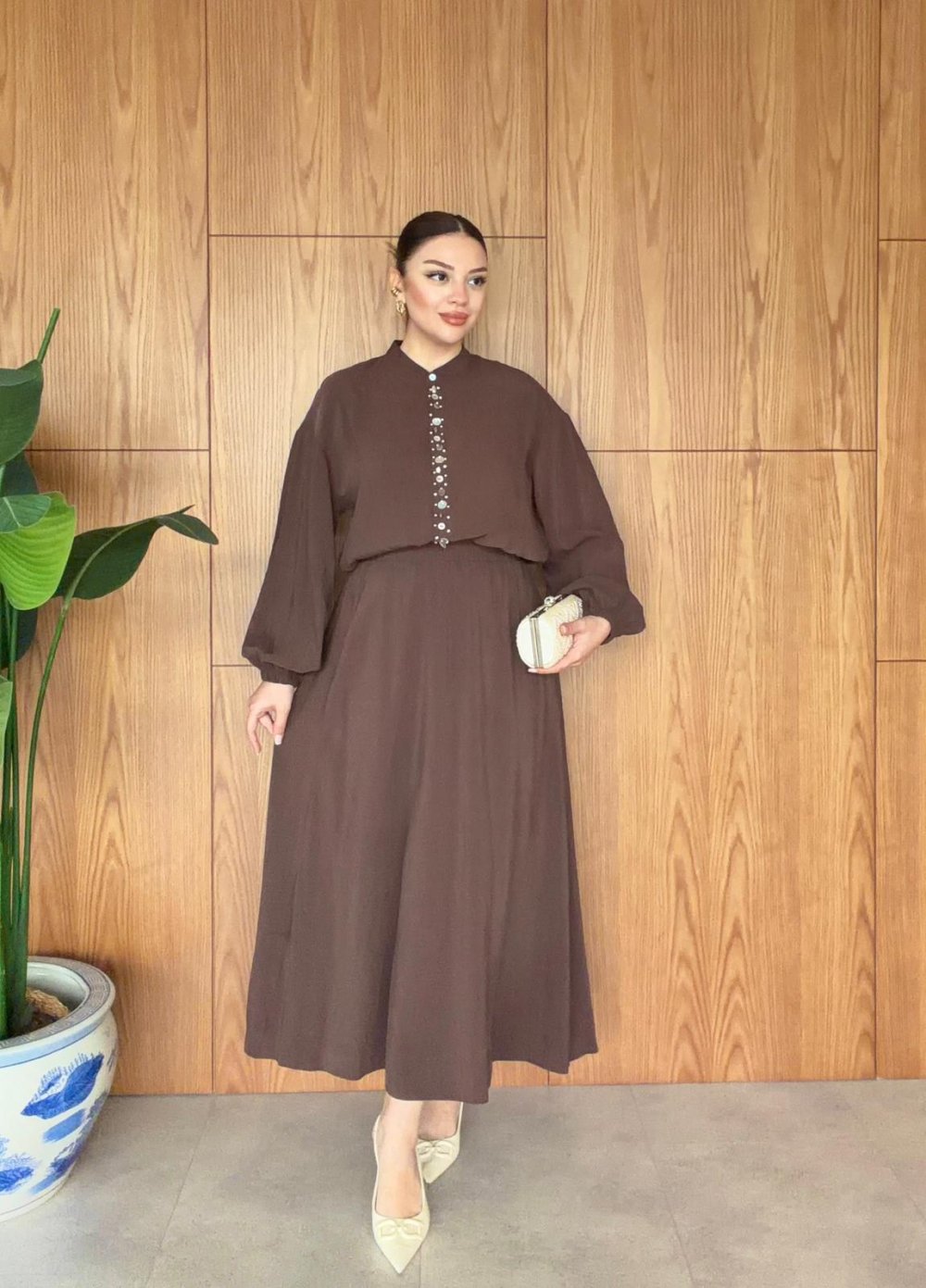 Gömlek: Önden düğmeli ve taş detaylıdır.
