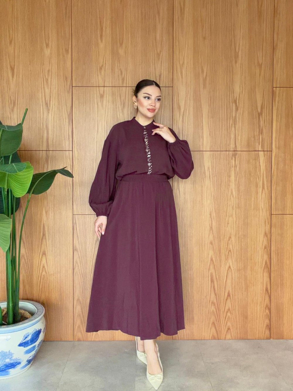 Gömlek: Önden düğmeli ve taş detaylıdır.