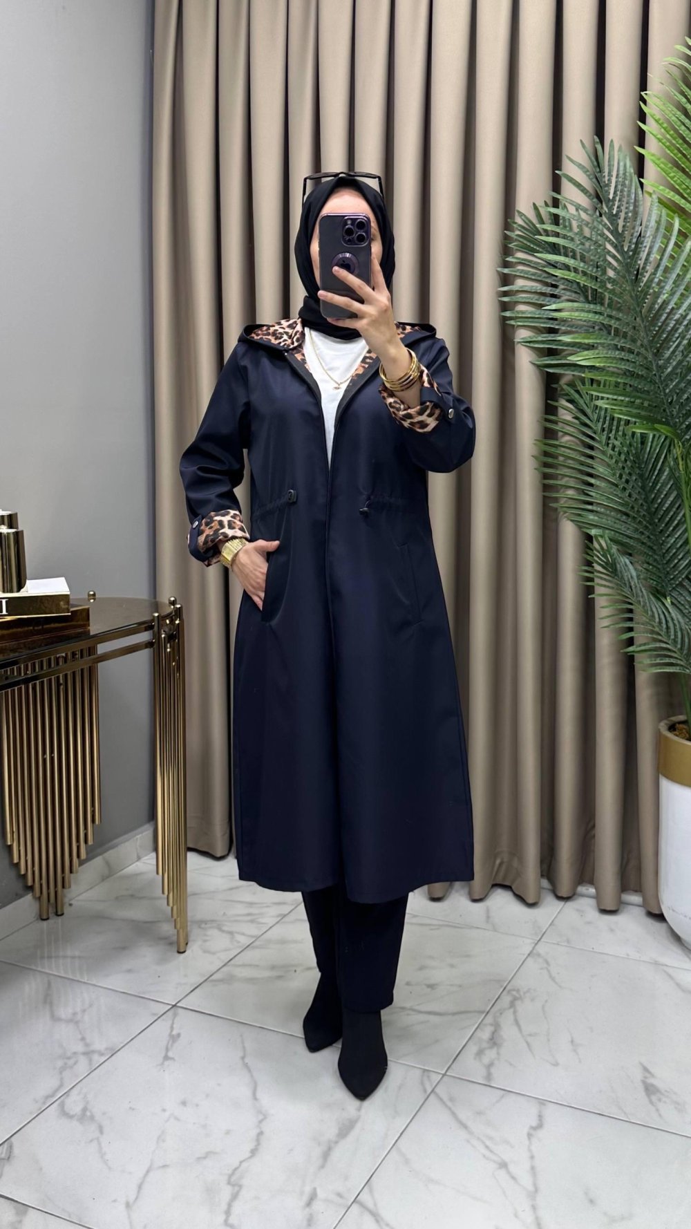 Leopar astarlı, cepli, fermuarlı , bağcıklı, kapşonlu. Boy 110 cm
