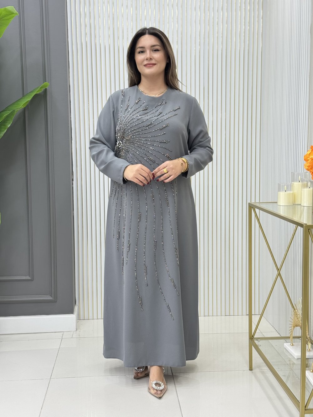Krep kumaştır, taş işlemelidir.
