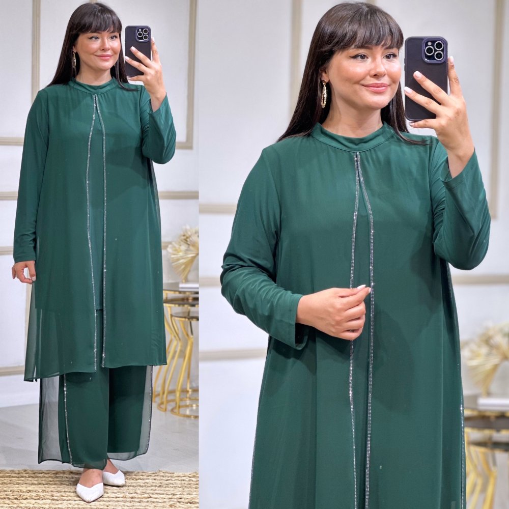 Şifon kısımlarında yırtmaç ve taş detayları vardır.
