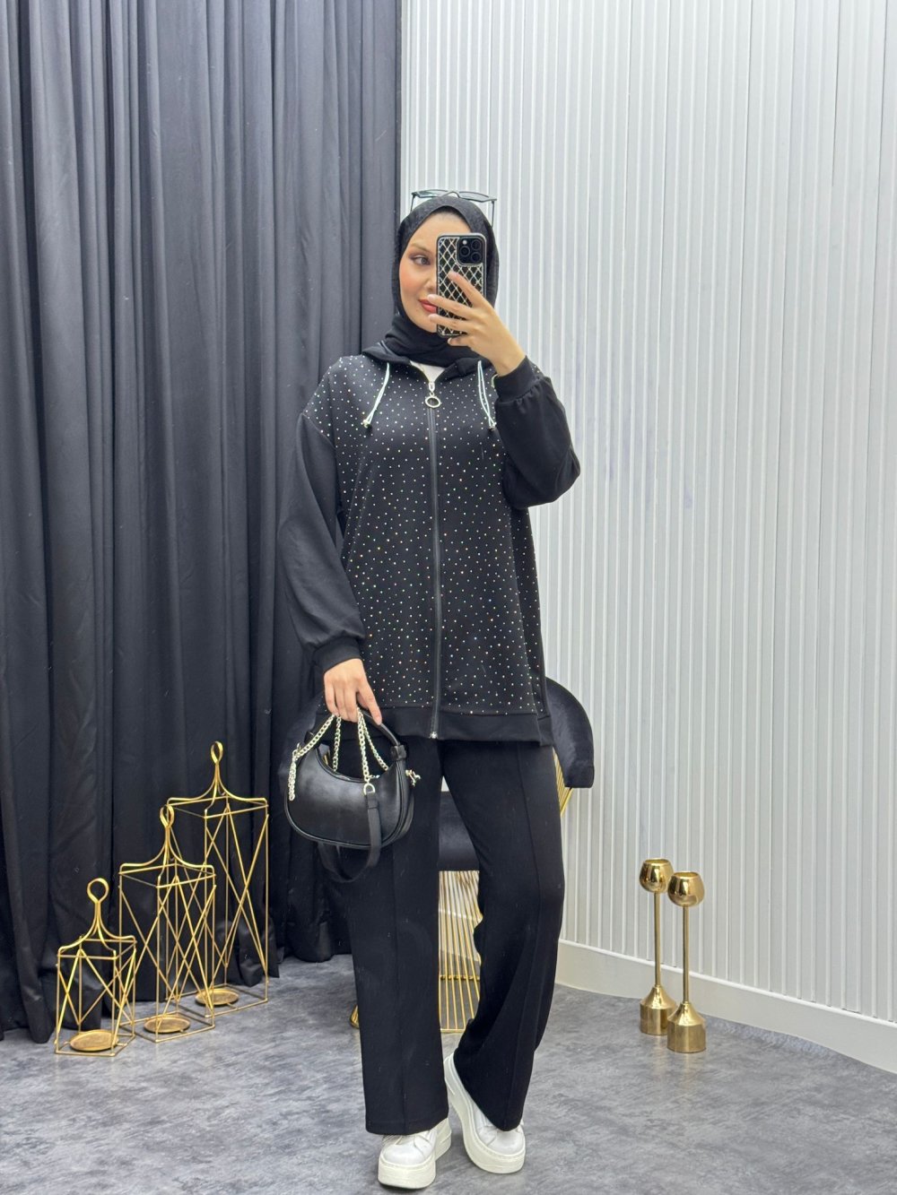 Tunik full serpme taşlı tunik bisiklet yaka pantolon belden lastikli