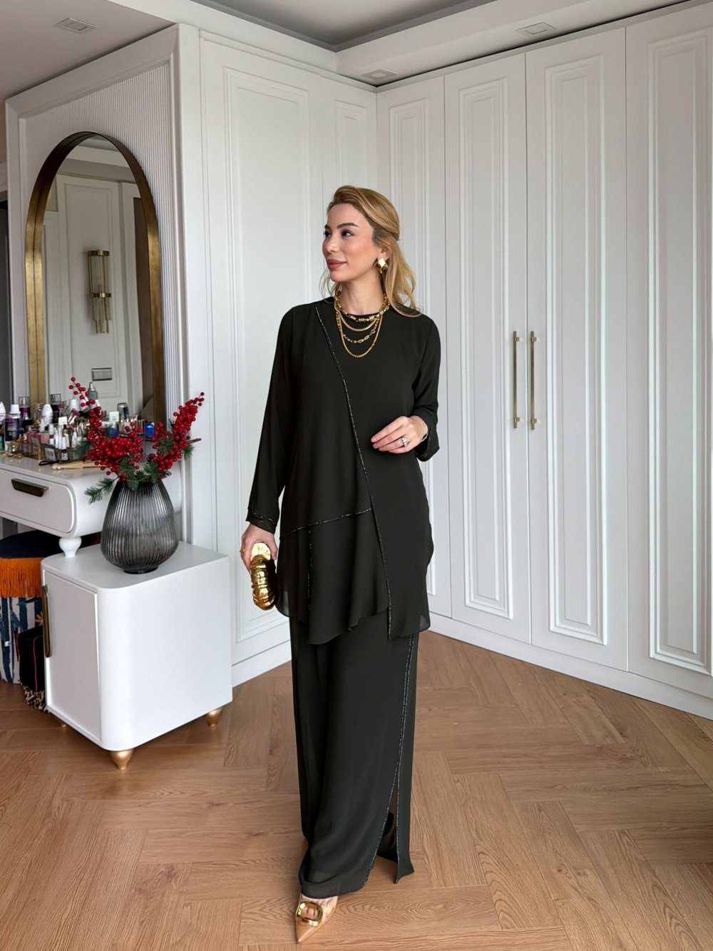 *Tunik asimetrik kesim detaylıdır