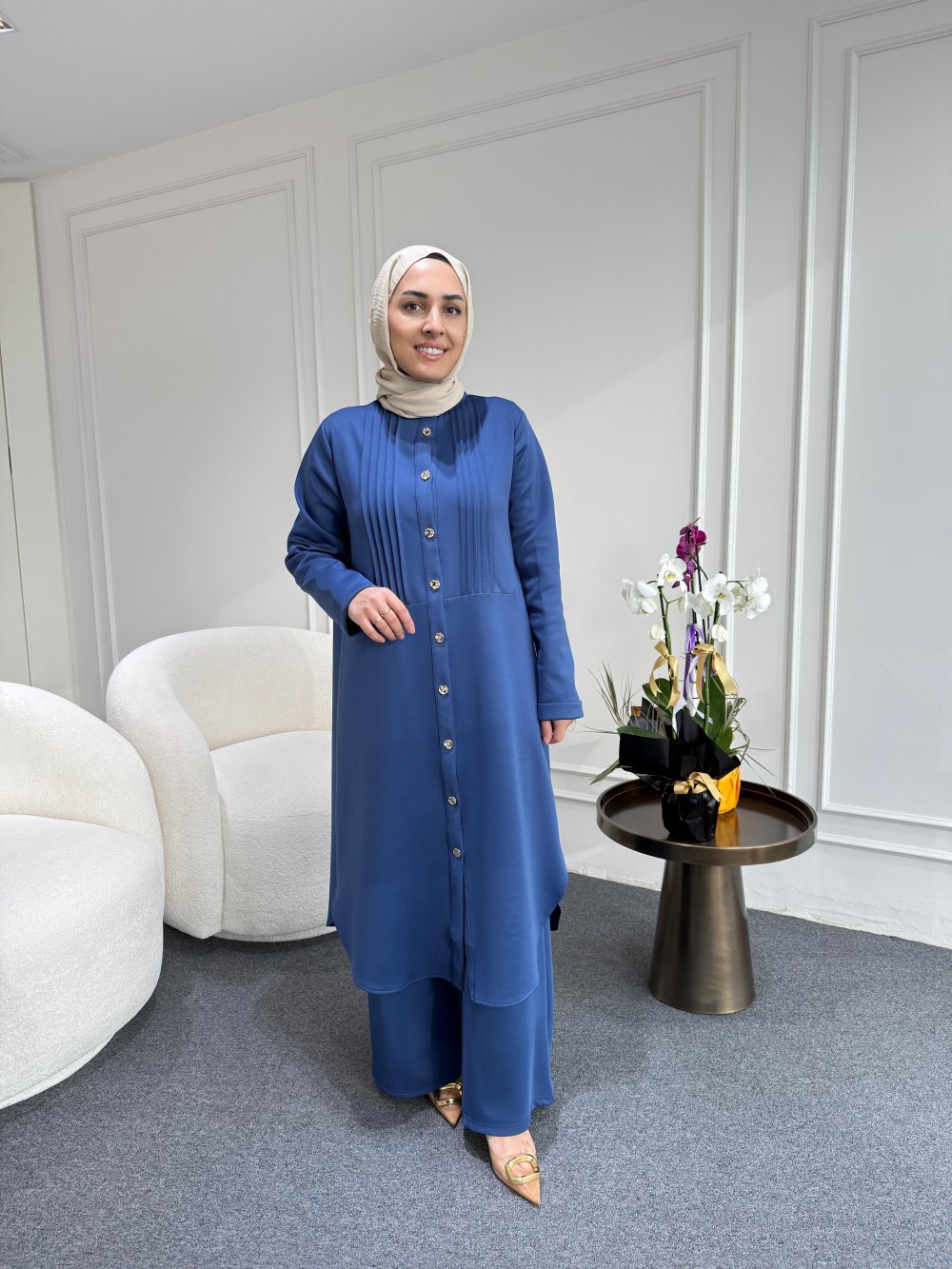 Tunik boy 115 cm’dir. Önünde gold düğme ve nervürü bulunmaktadır.
