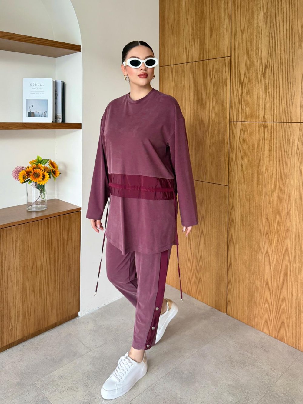 Pantolon: Yanlardan şerit ve metal düğme detaylıdır.