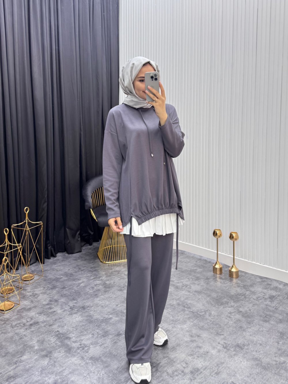 Ürün tunik ve pantolon olmak üzere iki parçadan oluşmaktadır. Tunik asimetrik kesim önden büzgü ve bağcık detaylıdır. kapüşonludur. Pantolon belden lastiklidir. Kombin de etek içlik kullanılmıştır. İçlik ürüne dahil değildir