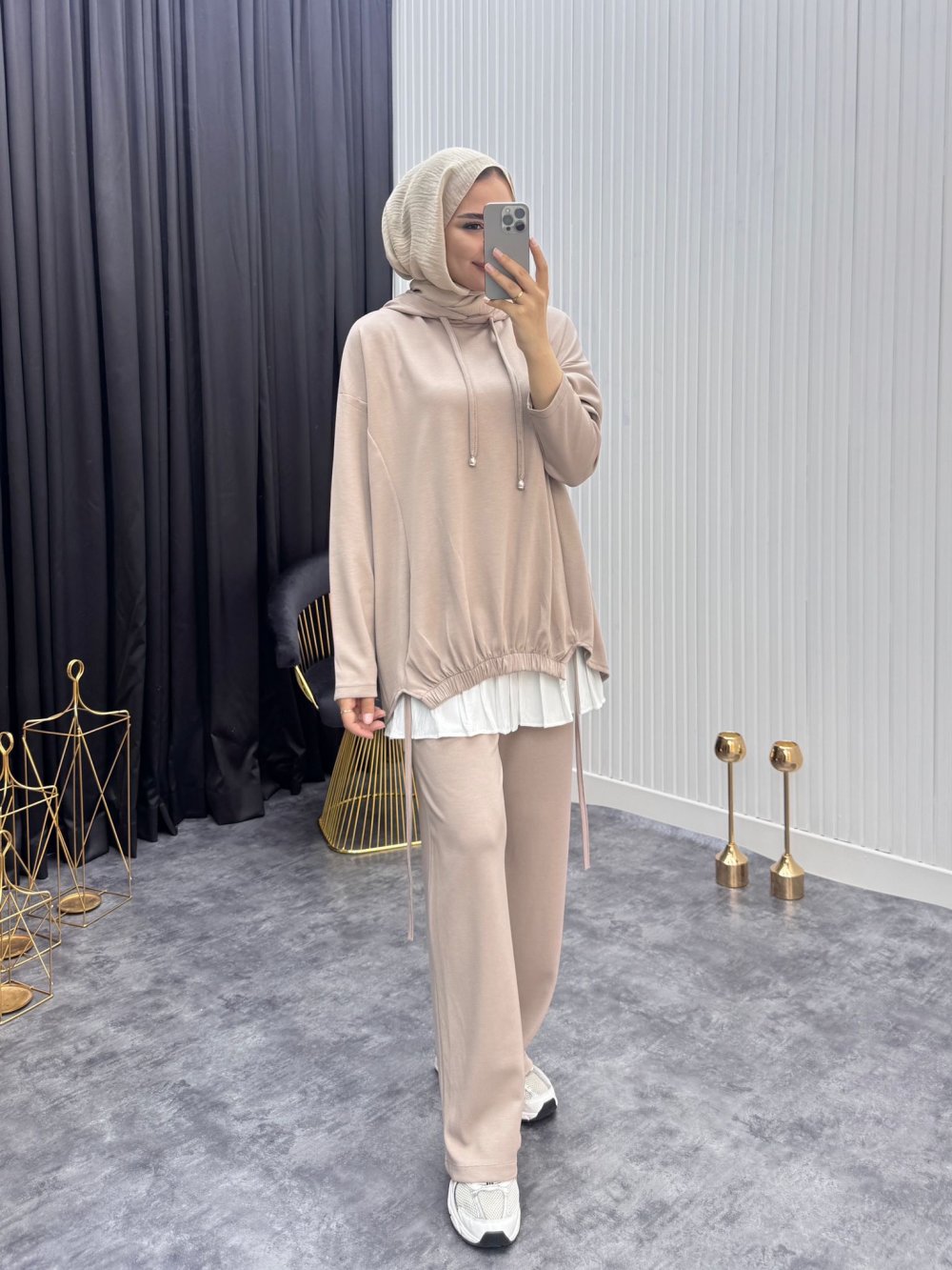 Ürün tunik ve pantolon olmak üzere iki parçadan oluşmaktadır. Tunik asimetrik kesim önden büzgü ve bağcık detaylıdır. kapüşonludur. Pantolon belden lastiklidir. Kombin de etek içlik kullanılmıştır. İçlik ürüne dahil değildir
