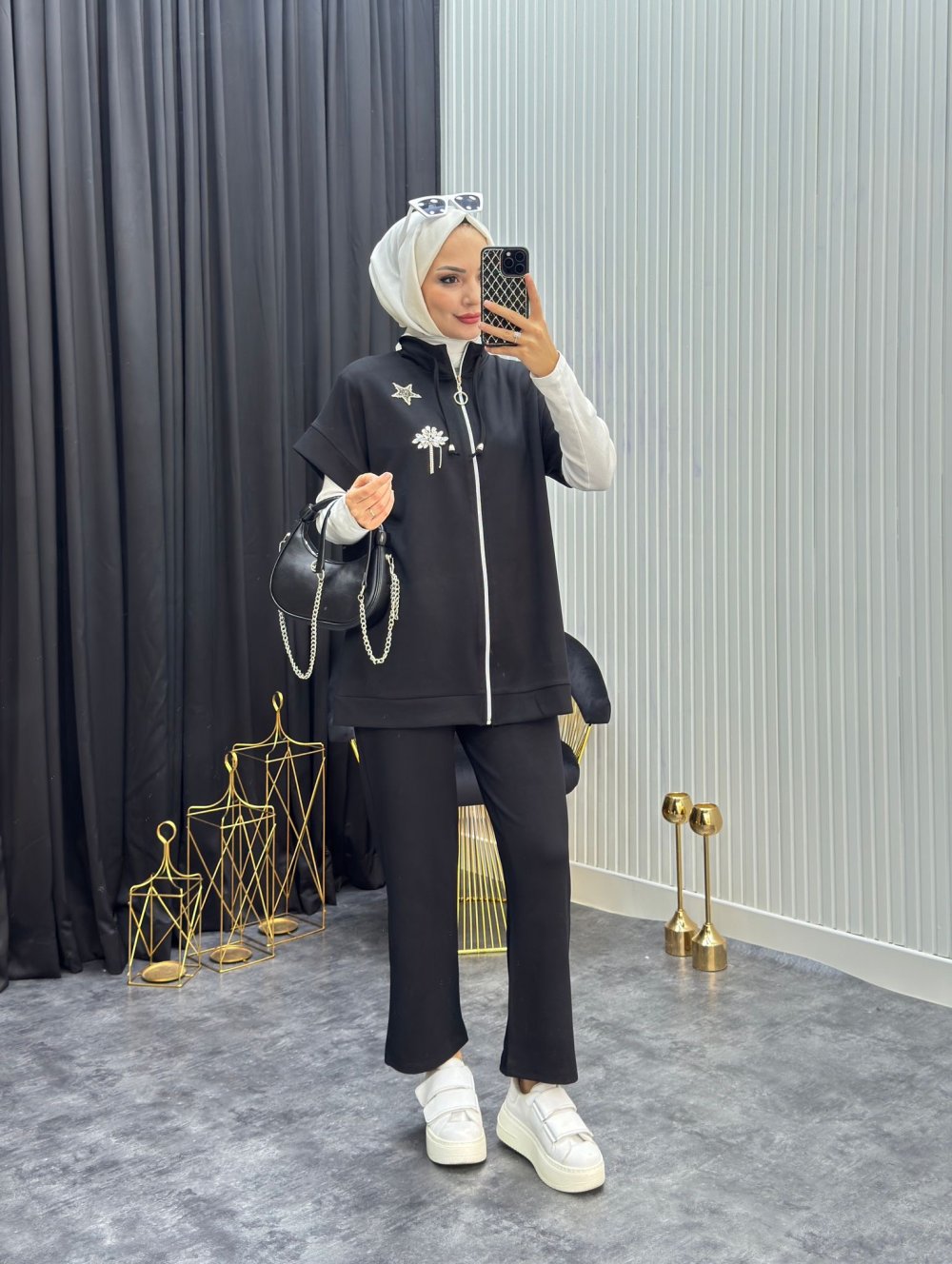 Yelek önden fermuarlı üzeri taş işlemeli pantolon belden lastikli.