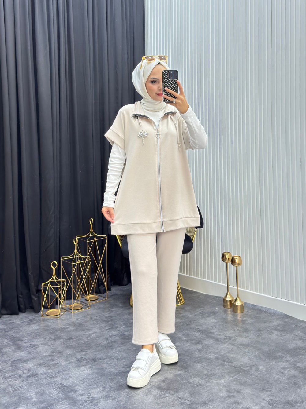 Yelek önden fermuarlı üzeri taş işlemeli pantolon belden lastikli.