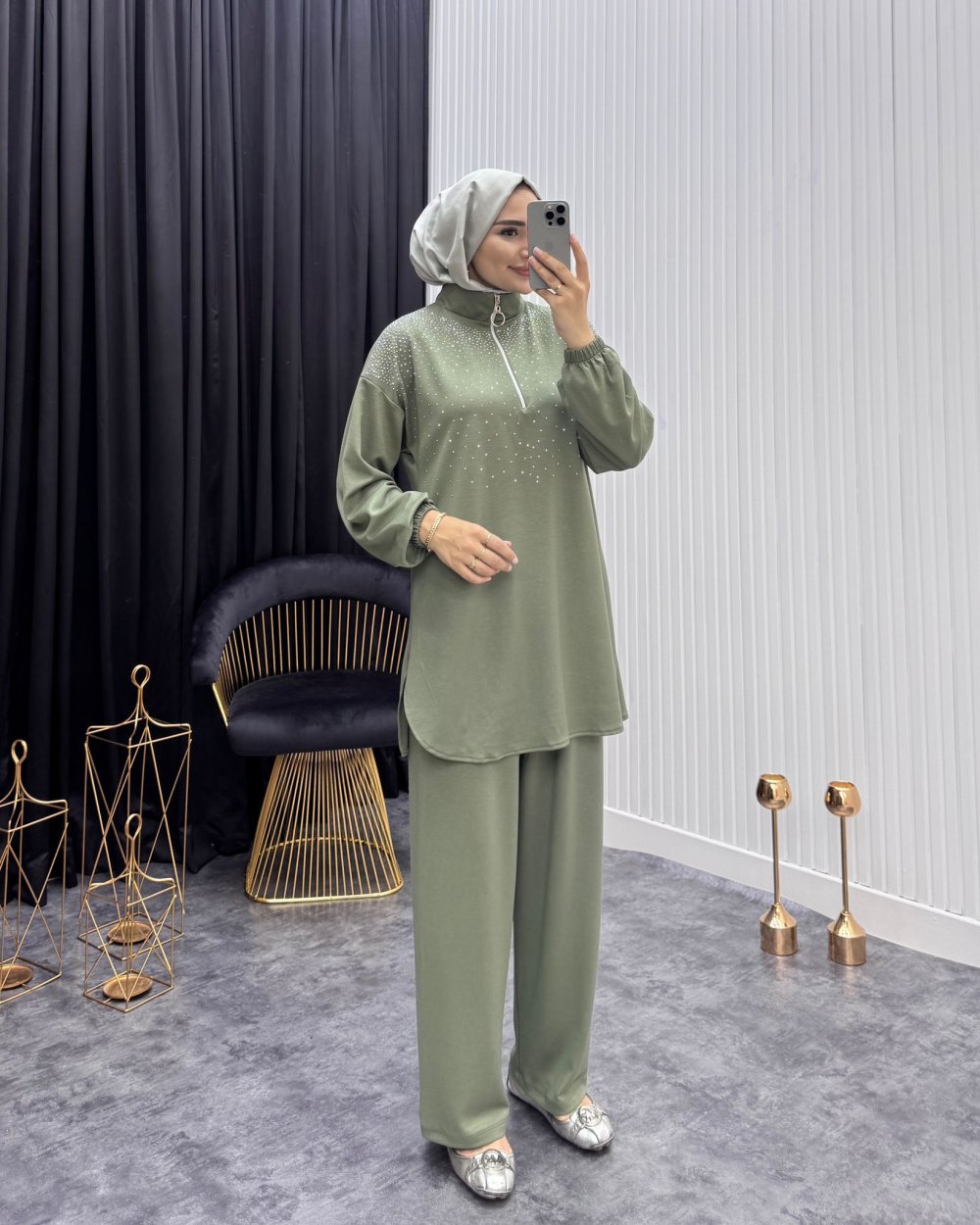 tunik önden fermuarlı taş detaylı pantolon beli lastikli
