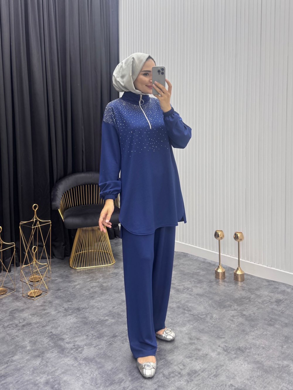 tunik önden fermuarlı taş detaylı pantolon beli lastikli